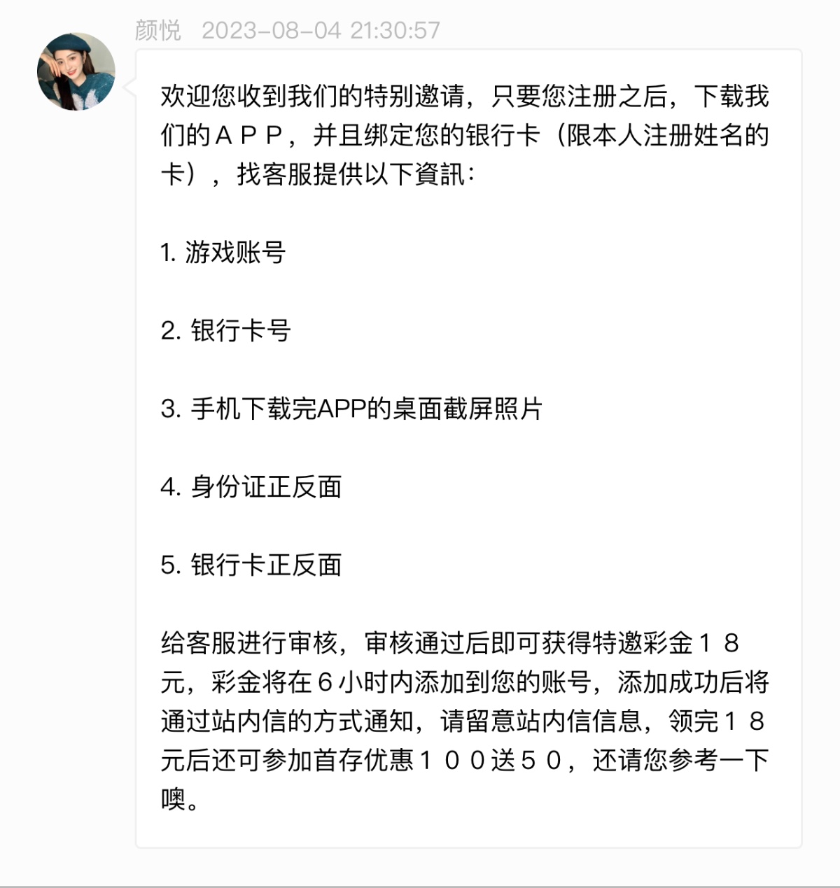 给客服进行审核,审核通过后即可获得特邀彩金18元,彩金将在6小时内添加到您的账号,添加成功后将通过站内信的方式通知,请留意站内信信息