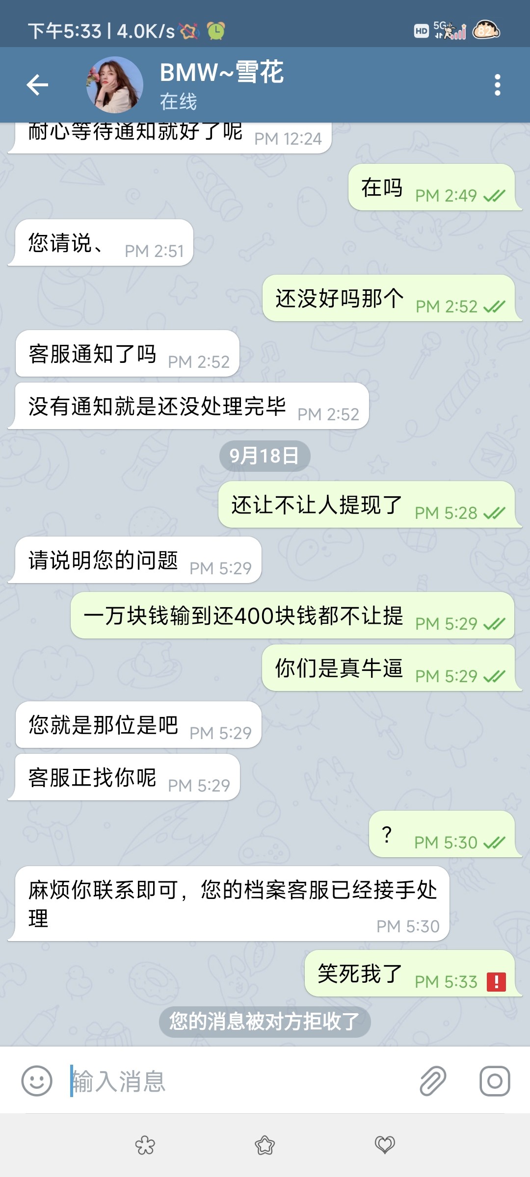 都看清楚了,这sm平台,玩大额的注意了,一年爆大钱就不给提,卡了两天直接封号