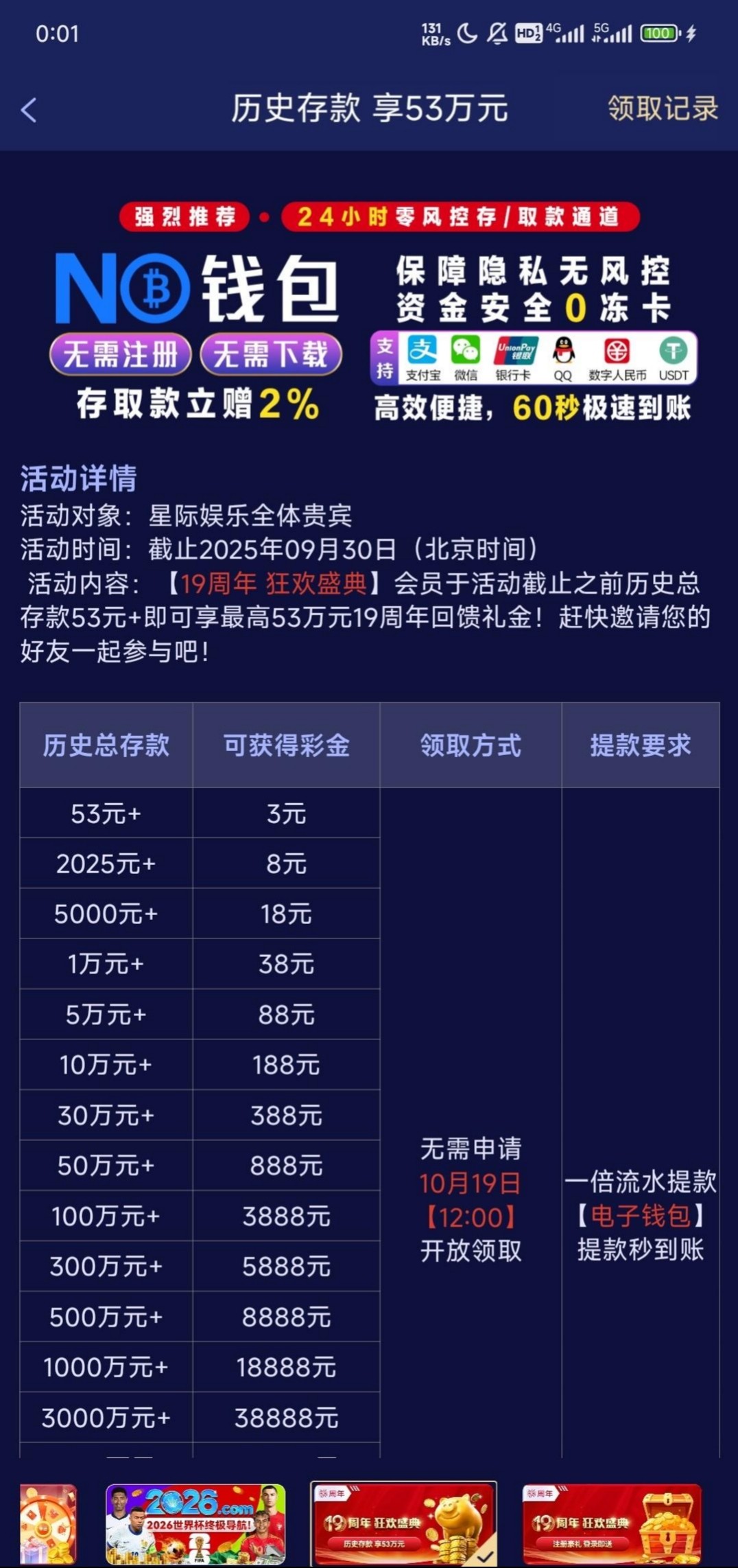 星际娱乐有周年历史存款彩金,中午12点后去领,有等级的去看看,每两小时还能抢一次红包 053.com